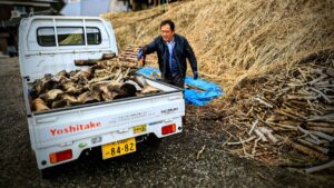 御杖村に行った理由の1つに薪の片付けを吉田社長と行いました。