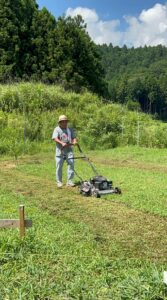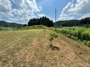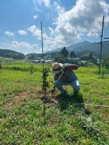 果樹の周りの雑草は手作業で行い、その後、草刈り機で刈っていきます。