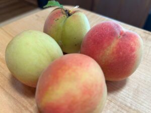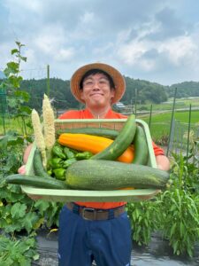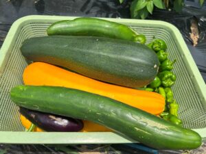 ズッキーニ、きゅうり、トマト、ピーマン、ししとう、なすび、もも・・・初収穫は好調です。