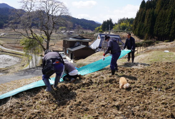 こんにちは、営業部の塩垣です!今回は果樹園作り第2段?防草シート貼りとフェンス作りの様子をお届けします!まずは防草シート貼り。防草シートは太陽光を遮断し、雑草の成長を妨げる役割をしてくれます。これを果樹園となる敷地の外周にぐるりと貼ってきました。作業自体はシートを敷いてピンで固定するだけと簡単。ですが、広大な敷地に加え作業日はあいにくの強風……。敷いた先からシートが飛んでしまうため、5人でシートを抑えながら必死に固定していきました。やっとのことで防草シートを貼り終わったらお次はフェンス!植えた作物が動物に食べられないよう、荒らされないようにフェンスを建てました?先ほど貼った防草シートの上から、社長お手製の道具で杭を打っていきます。間隔はだいたい2m50㎝。こちらもぐるりと1周建てました。そして杭が打ち終わったらネットの取付。杭に引っ掛ける場所があるので、そこにハンマーを使って固定していきました。こちらも作業内容的には難しくないのですが、いかんせん全てが重い!男性陣が率先してやってくれたのですが、杭もネットも重量があり体力の消費が激しそうでした……。次回はようやく果物を植えていきます!お楽しみに!