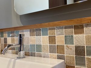 薄いブルーの壁紙と様々な模様のタイルを使用しており、無垢板のカウンターと濃い茶色の建具と合わせることで