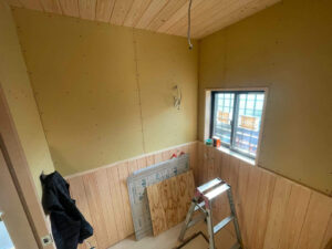 天井と壁は、ヒノキの羽目板を張りました。一部分の壁は、タイル仕上げにしています。