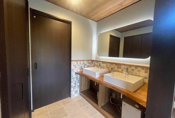 こんにちは!本日も工事が着々と進んでおります。9月の着工から早2か月が経ち、11月中旬にトイレ・洗面工事が完成しました!洗面工事☆before ☆工事中 ☆after お風呂、小便器、洋式トイレがあったところを解体し、洋式トイレと洗面所に変化しました。大きな鏡とふたつの洗面器があることで、広々と快適に使用することができます!薄いブルーの壁紙と様々な模様のタイルを使用しており、無垢板のカウンターと濃い茶色の建具と合わせることで古民家の雰囲気に合わせつつ、清潔感のある明るい洗面室になりました?トイレ工事☆before☆after 元々お風呂場があったところを解体し、おしゃれなアクセントクロスのトイレへと変化させました!グレーを基調とした空間に、花柄の刺繍のようなテクスチャーのあるクロスをアクセントにしており、天井はキラキラした紺色のクロスで仕上げています。こちらのインパクトのある壁紙は・・・ 先日のブログでもご紹介した輸入壁紙専門店WALPA様で購入したものです!トイレという狭い空間だからこその大胆なクロス選びです✨とても素敵な壁紙が他にもたくさんありましたので、今後どこかでまた使用してみたいなと思います?